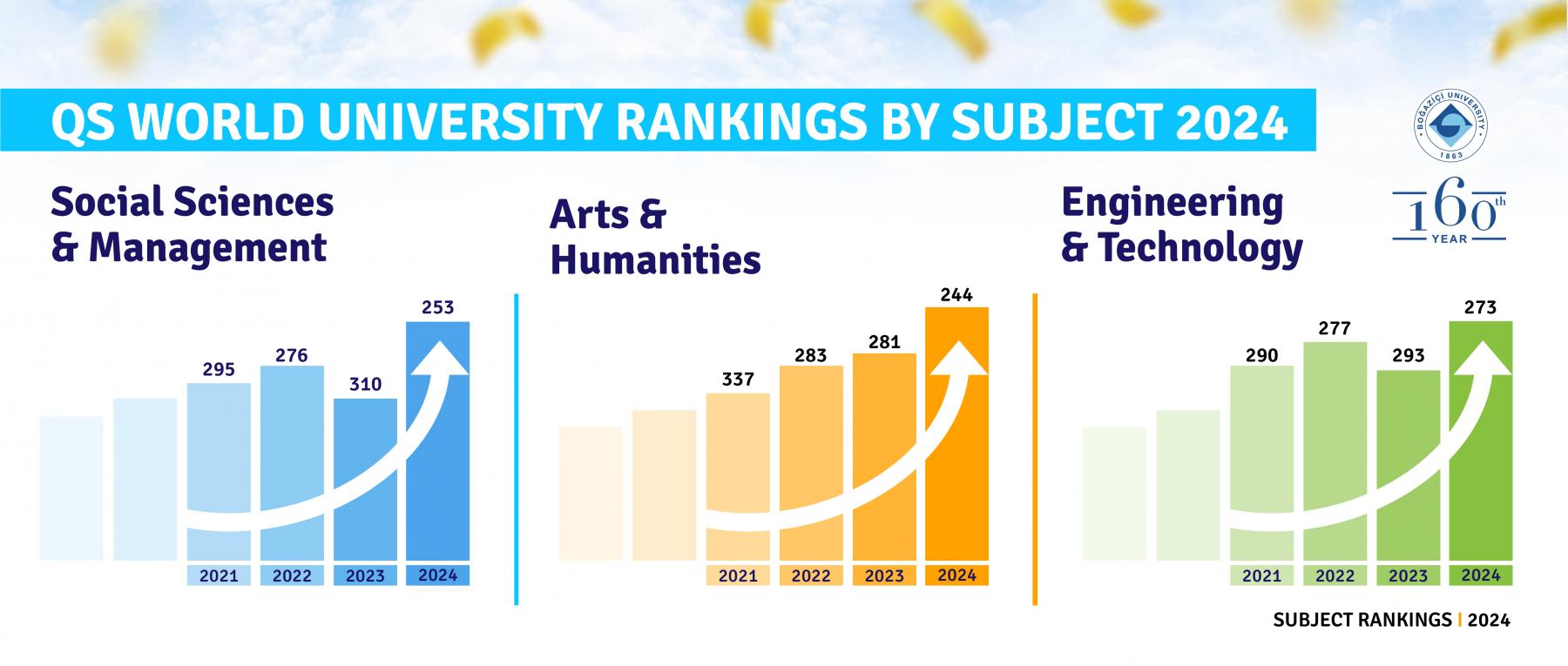 Boğaziçi University has improved its performance in the QS World University Rankings by Subject 2024 compared to previous years. Accordingly, Boğaziçi University is ranked in the top 300 in the world in 3 out of 5 broad faculty areas, in the top 150 in 2 narrow subject areas, in the top 250 in 8 narrow subject areas, and in the top 400 in 14 narrow subject areas.