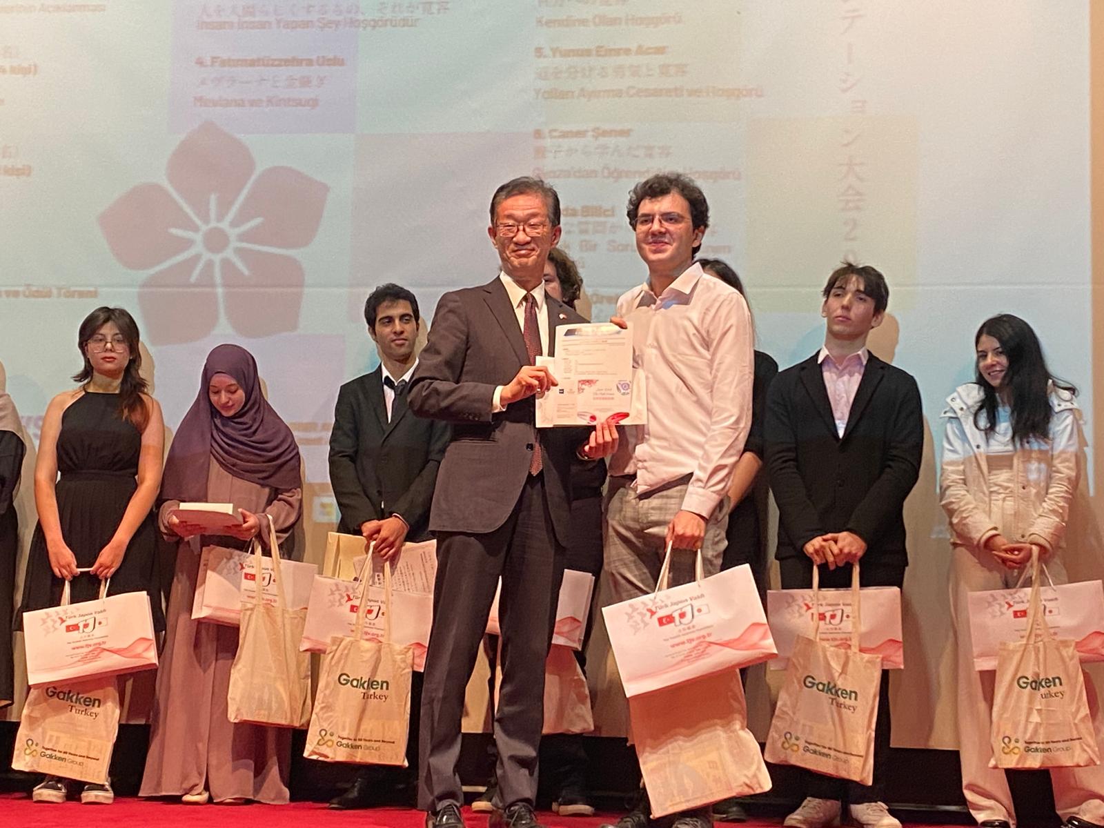 The awards of Zehra Ülgen Arık, who won first place in Group A with her presentation titled “The Guardianship of the Night, the Warmth of the Sun,” and Arda Bilici, who secured first place in Group B with his presentation titled “Tolerance Seen Through a Small Question,” were personally presented by Ambassador Masami Tamura.