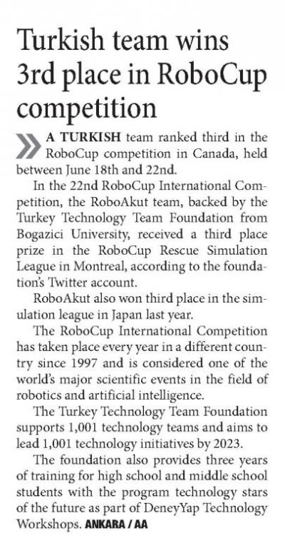 Turkish team wins 3rd place in RoboCup competition