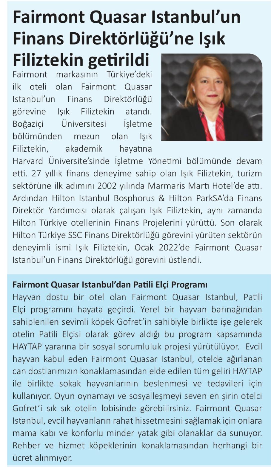 Fairmont Quasar İstanbul'un Finans Direktörlüğü'ne Işık Filiztekin getirildi