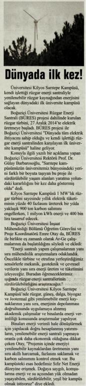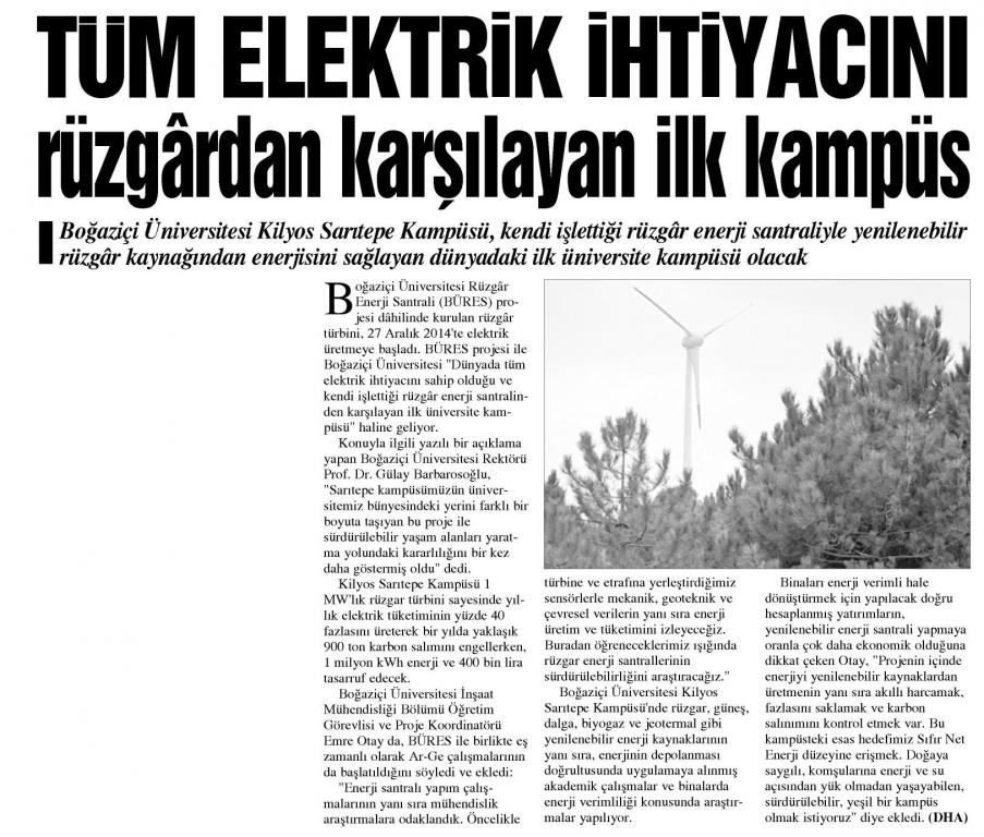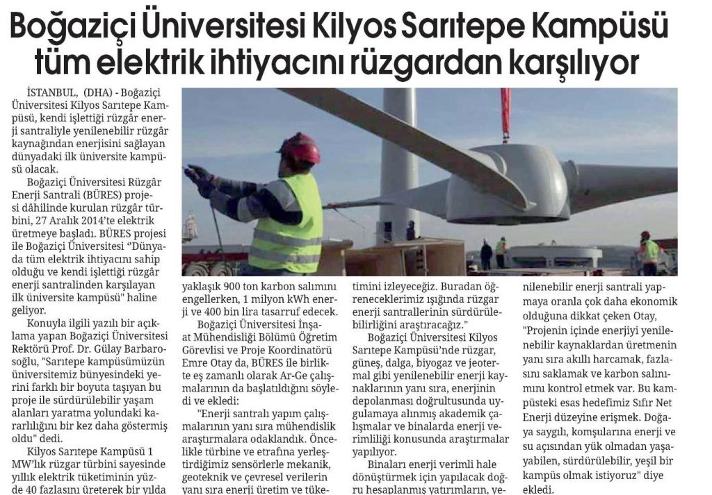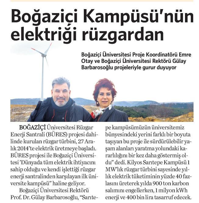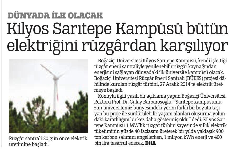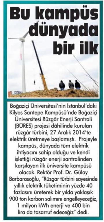 Aralık 2014 itibariyle faaliyete geçen Boğaziçi Üniversitesi Rüzgar Enerjisi Santrali 10 Ocak 2015 tarihinde TRT'de Ana Haber'e konu oldu.