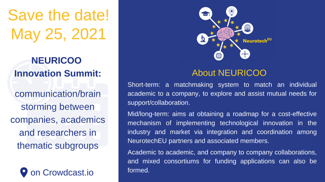 Anketin tamamlanmasını takiben Boğaziçi Üniversitesi koordinasyonunda yapılacak çalışmayla 25 Mayıs 2021 günü Crowdcast üstünden farklı alanlar için paralel oturumlarla yürütülecek bir inovasyon etkinliği gerçekleştirilecek. Bu tür etkinlikler tekrarlanarak NEURICOO’nun NeurotechEU içinde bir teknolojik inovasyon ekosistemi oluşturulacak.