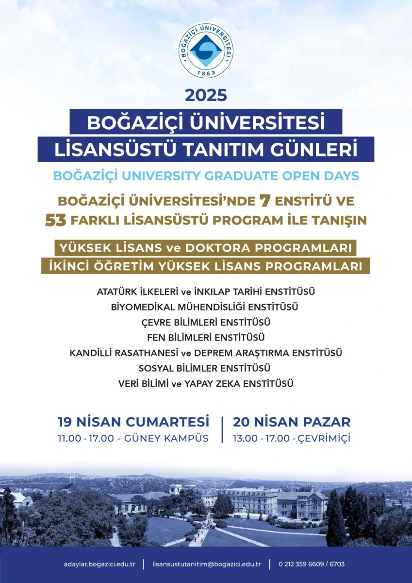 Akademik yetkinliklerini geliştirmek, kariyerini derinleştirmek ve uluslararası düzeyde rekabetçi bir araştırma ortamında yer almak isteyen tüm adayları, Boğaziçi Üniversitesi Lisansüstü Tanıtım Günleri’ne bekliyoruz.